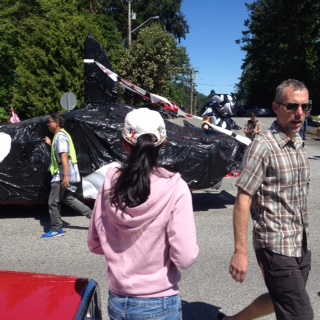 Saturday, Bolt Across Canada was in Pender Harbour BC for the May day festivities. With locals lining the parade route we were part of the procession which included vintage cars, our favourite MLA Nicholas Simons riding a duck bike, cowgirls riding horses, kilt-wearing bagpipers, 6 legged spotted salmon creations, candy tossing octopus, fire engines, beavers wearing Canadian flags and a gaggle of sparkling kids.